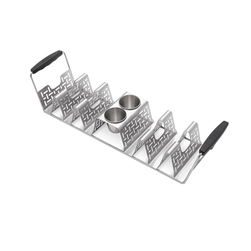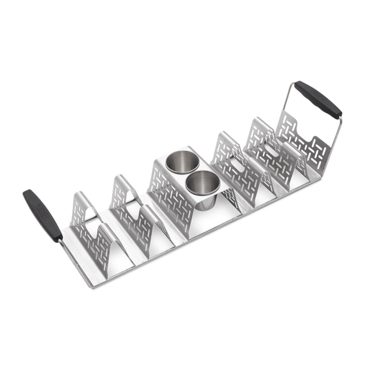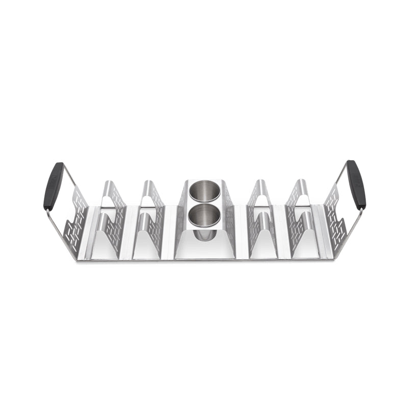 Κάντε κάθε ημέρα.... ημέρα - taco. Φτιάξτε έως και έξι tacos σε αυτόν τον premium δίσκο σερβιρίσματος taco από ανοξείδωτο χάλυβα. Σχεδιασμένος με λαβές σιλικόνης για εύκολη μεταφορά από την ψησταριά στο τραπέζι. Με 2 θήκες για σάλτσες και guacamole!